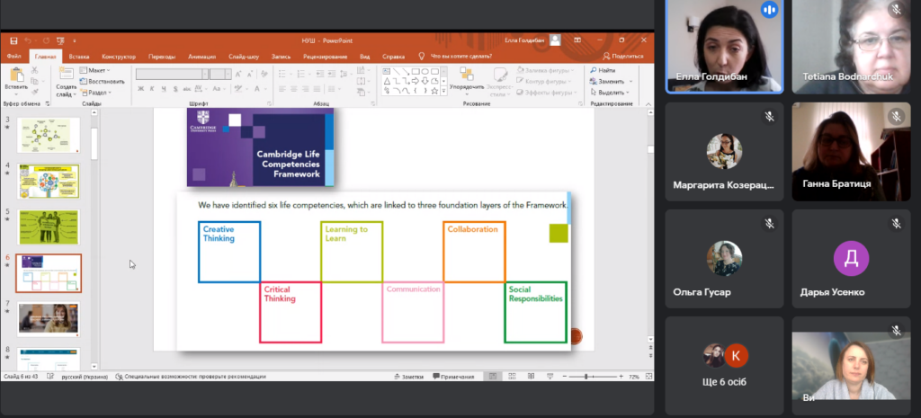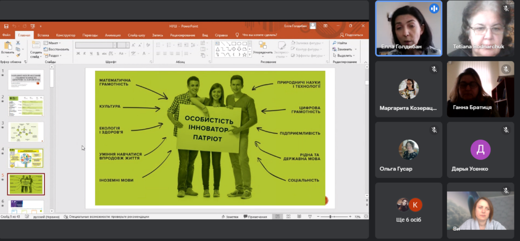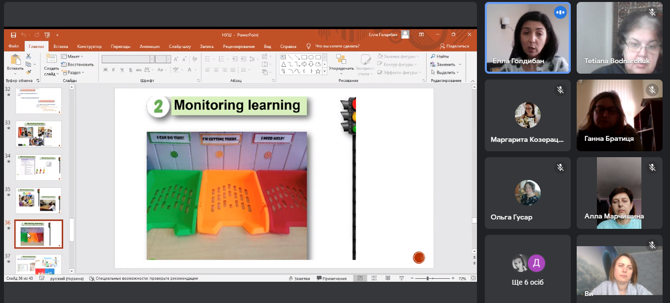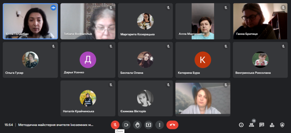 Серед практичних аспектів навчання англійської мови по-новому, Елла Петрівна запропонувала учасникам нові технології формування іншомовної комунікативної компетентності (вивчення граматики та лексики, навчання говорінню тощо). Особливо цікавими є прийоми організації формувального та підсумкового оцінювання (використання кольорових карток, смайлів / символів, ящичків тощо), які особисто використовує уроках. Звісно, що епоха цифрових технологій розкриває широкі можливості щодо застосування в освітньому процесі гаджетів, а дистанційне навчання вимагає переорієнтації на активне використання різних онлайн-інструментів. Насамкінець Елла Петрівна зазначила, що рефлексія – невід’ємна складова кожного уроку, а прийомів її проведення надзвичайно багато. Серед найулюбленіших – використання застосунку Classtime, який учасники випробували під час зустрічі.