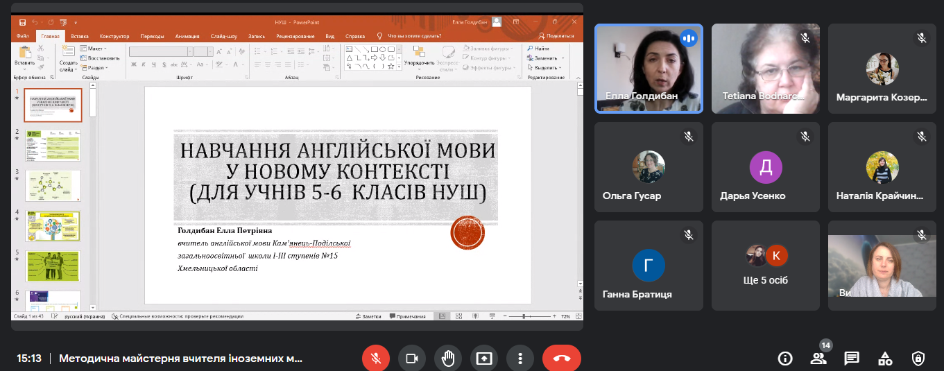 Саме ці питання обговорювали учасники Методичної майстерні вчителя іноземних мов, засідання якої відбулося 20 квітня 2022 року. Гостею майстерки була вчитель англійської мови вищої категорії Кам’янець-Подільської загальноосвітньої школи І-ІІІ ступенів №15 Елла Петрівна Голдибан, яка зосередила увагу на темі «Навчання англійської мови у новому контексті (для учнів 5-6 класів НУШ)». До зустрічі долучилися здобувачі вищої освіти факультету іноземної філології, а також науково-педагогічні працівники.