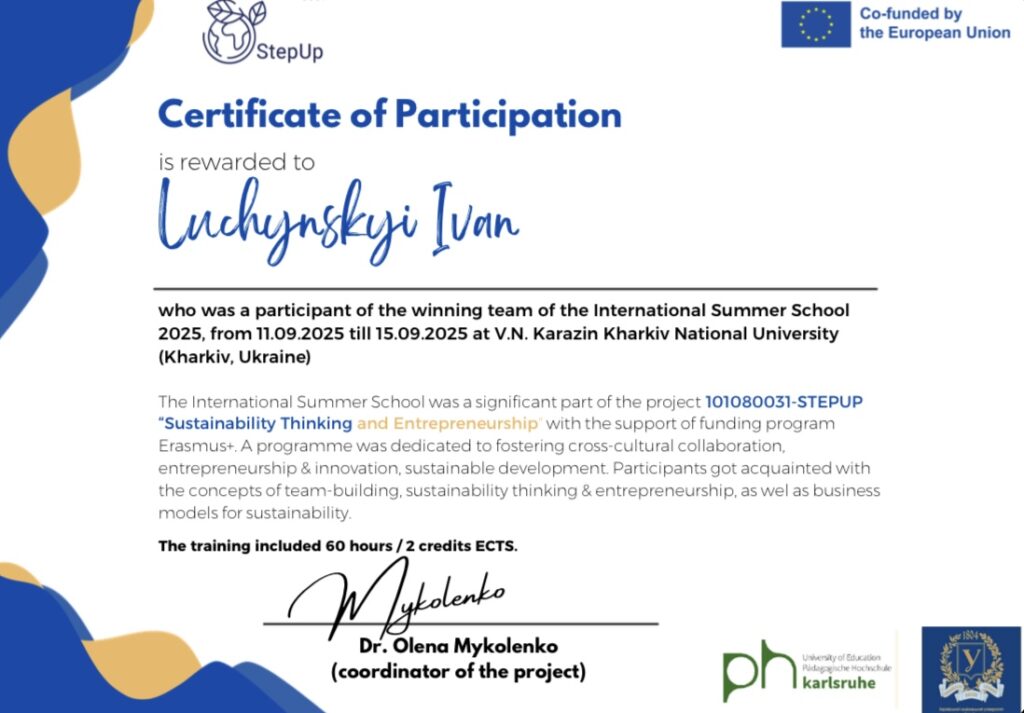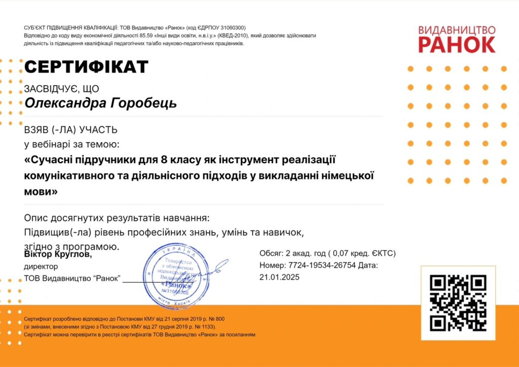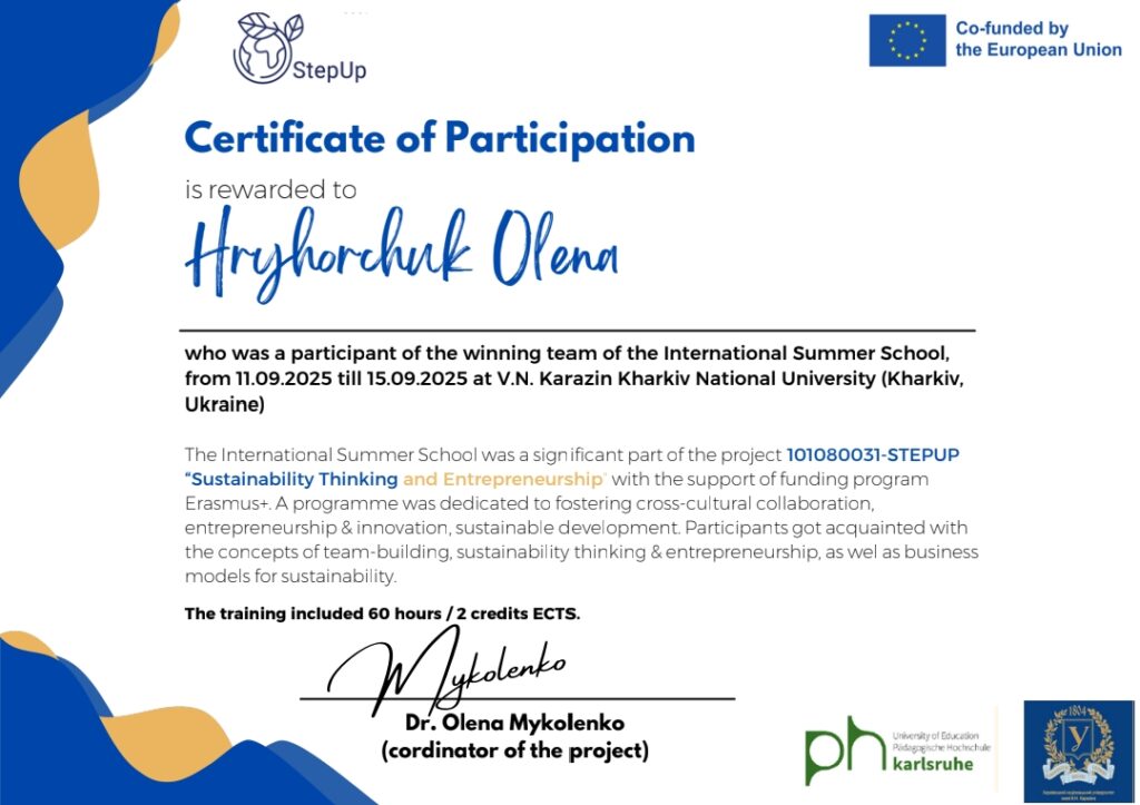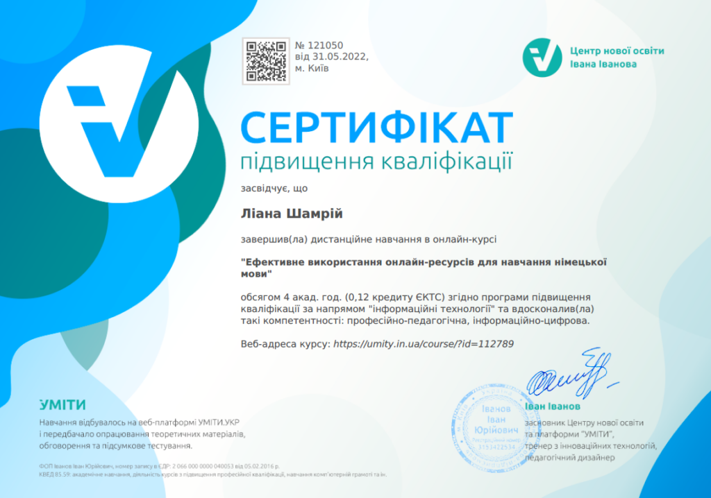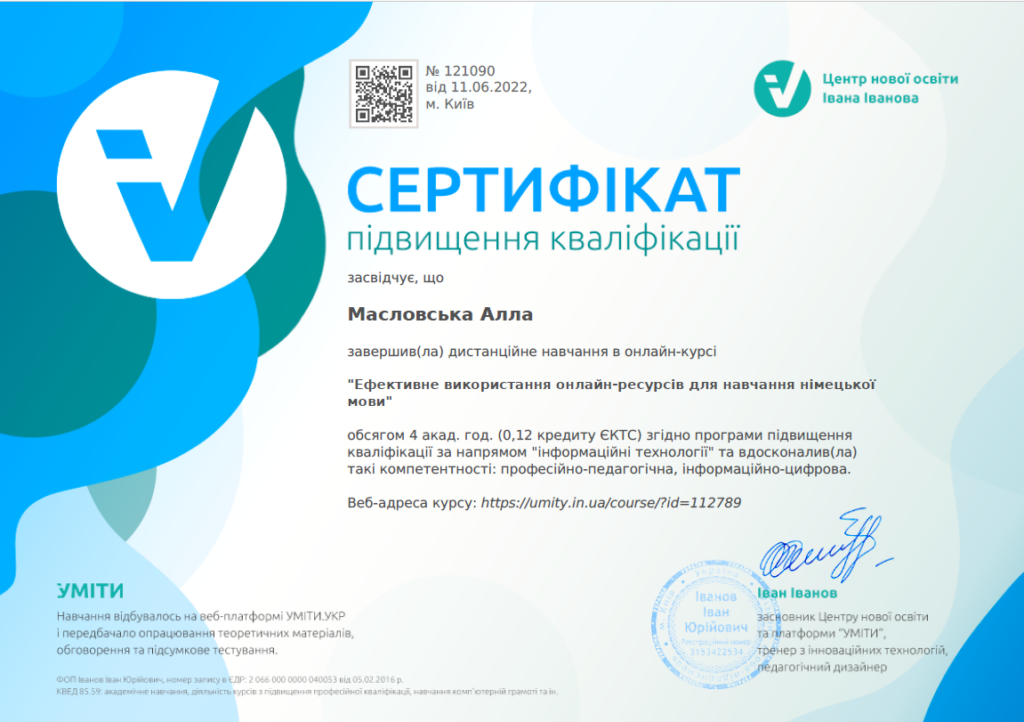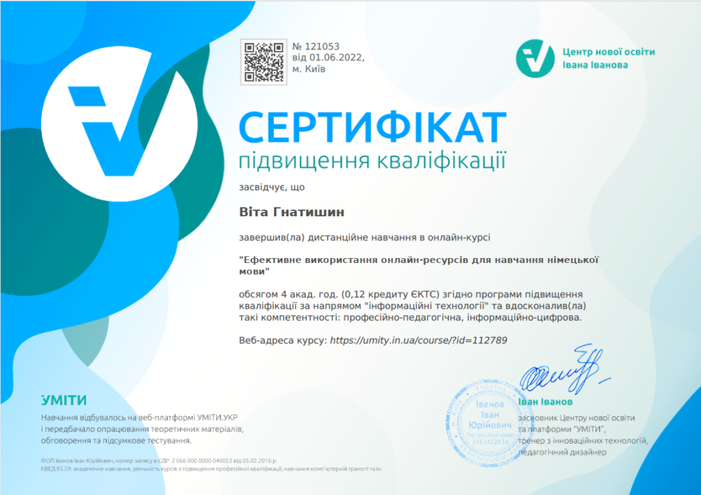 Вітаємо здобувачку вищої освіти Ольгу Осадчук з успішним завершенням курсів професійного розвитку від Goethe Institut