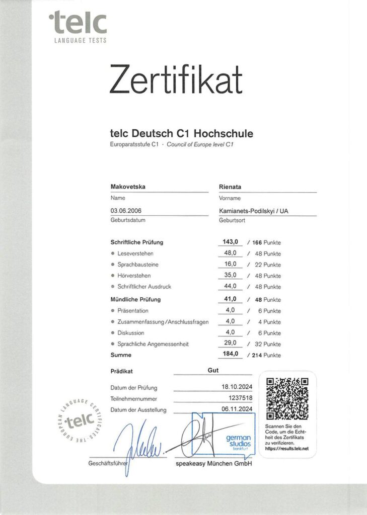 Маковецька Рената отримала сертифікат C1 Telc Hochschule!!! |