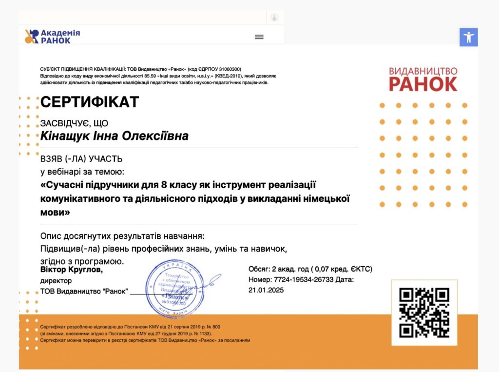 Вітаємо здобувачку вищої освіти Тетяну Рибчак з успішним завершенням курсу від StartDeutsch Schule |